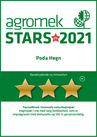 FaunaWood hegnspælen er 1 af kun 6 produktnyheder, der opnåede de eftertragtede 3 stjerner ved Agromek Stars 2021. En udmærkelse, der gives til banebrydende nye og innovative produkter.