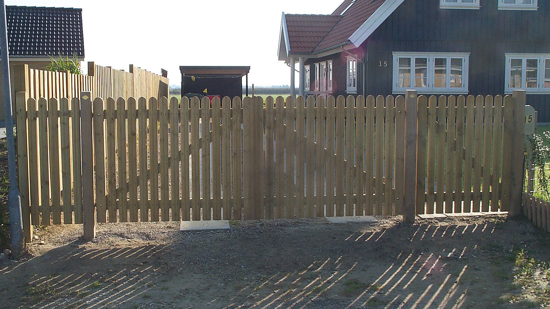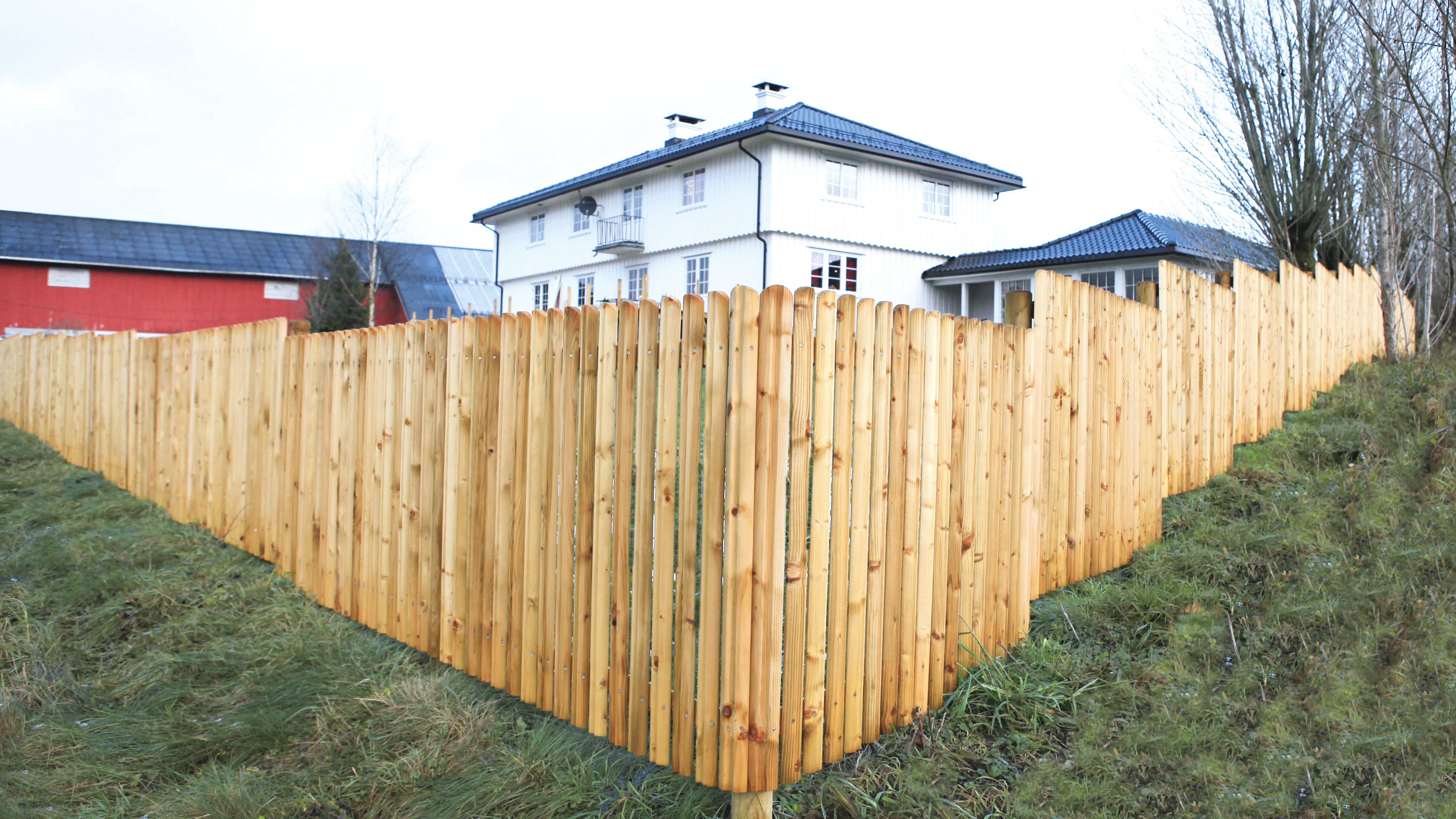 Hele hegnet er trykimprægneret og brædderne er udført i gedigne, halvskårne fyrretræslægter i dimension 27 x 75 mm. Afstanden mellem de lodrette brædder er med ca. 2 cm. Løsholterne er glathøvlede, 28 x 75 mm.